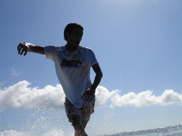 ここはタバルアのライト。サイズがない日はとてもかわいい波なんだけど、サイズが上がるともうお手上げ状態の波にある。この日はまだまだ小さくて、俺も遊べるサイズだった。ロングで、たくじくんとクルーズ。