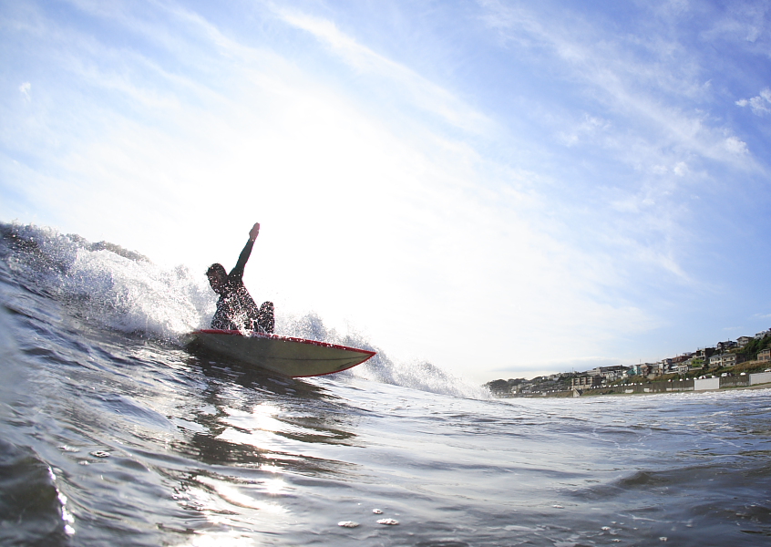 今日使った板は、303千葉公平さんシェープの、フィッシュケーキ。小さい波や、緩い波でもぐんぐんは走ってくれて、普段波の小さい鎌倉でも十分に楽しむ事ができるこの板は、俺のお気に入り。初めて生見で、Lekiにフィッシュケーキを借りて、その日にオーダーしたんだ。そのくらい調子がいい。