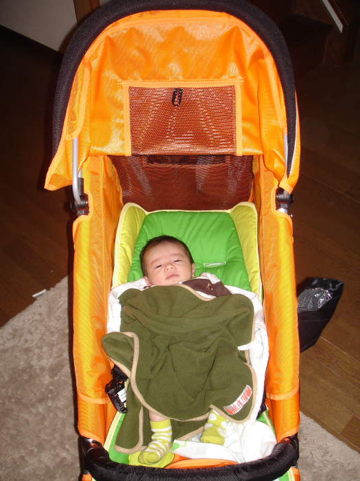 そして今は日本の島にいるnakiさんから、幸せのオレンジバギーを出産祝いで頂きました!俺が乗っても大丈夫なくらい、しっかりしたバギーです。