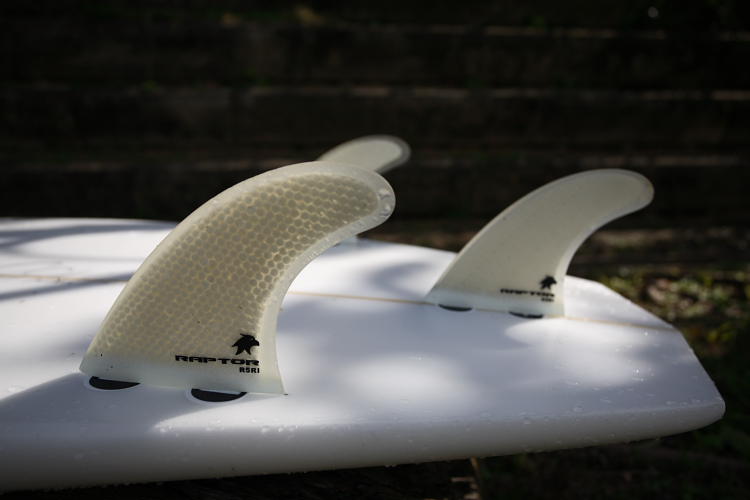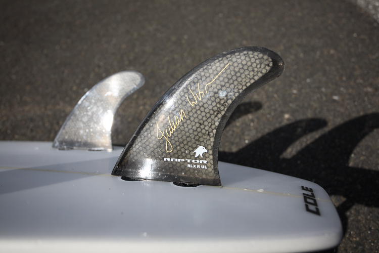 フィンはボックス、フィン共にRaptorフィンシステム。使用フィンはジュリアンウィルソンのシグネチャーフィン。固く、軽く、アクションやしっかりした波での使用に向いている。