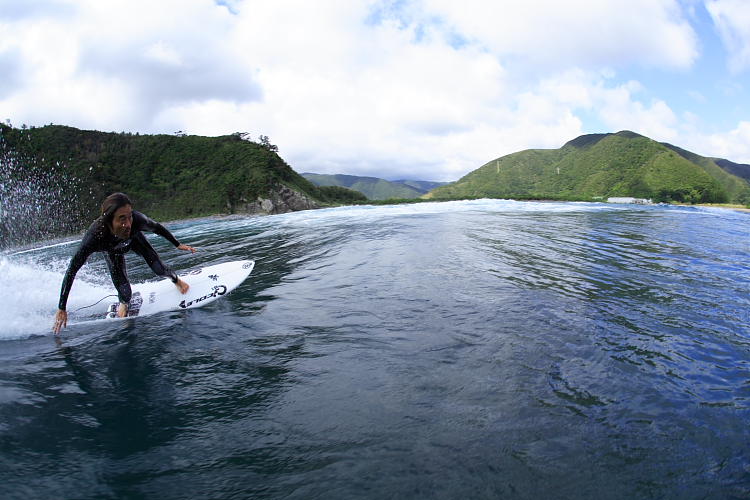 Nakiさんは、チューブ、リップ、カットバック、ボトムターンと力を抜いて楽しんでいた。この板はnakiさんのように力を抜いて波に乗る人に凄くあっているなと、海の中で見ていて思いました。