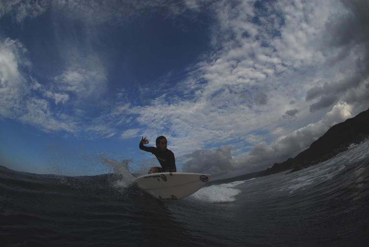 いつもの様な感覚でパドルをしてテイクオフを試みると、どうしても後ろ足が板よりも後ろに行ってしまうので、パドルの位置を気持ちノーズ寄りにして2回目のテイクオフ。今度は成功。板は思ったよりもぐんぐんとスピードをつけて行く。大きくとられたテールエンド、センターの幅を気にする事もなく、とてもムースに板が反応してくれた。板が短い分、本当に反応がよく、全てのライディングにおいて力を抜いて、軽—く波に乗るだけで板がすぅーっと動いてくれる。カットバックはいつもの様に低姿勢でという訳でもなく、かる〜く行きたい方向を見て、ちょっとレールを入れてあげる程度で、綺麗にカールに戻る事ができ、スープにあてる際も、本当に軽〜く当ててあげるとバッスっと板が返る。この動きがとても面白く、わざとパワースポットからはなれてカットバックをしてその反応の良さを楽しんだ。テイクオフも短いから、遅いのではと思っていたが、そんな事は全くなく逆に早いくらいだった。