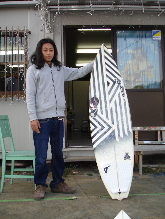 当初から話していたラウンドノーズではなく、ショートボードらしく、ポイントノーズでと言う要望も受け入れてくれ、かわいらしいアウトラインながらもしっかりとしたコンセプトが伺える。テールは名前からもわかるように、ダイアモンドテール。エッジはノーマルショートボードと同じくサイドフィン辺りまできっちり立っている。レールはMボキシー。ロッカーはとても綺麗でバランスがいい。日本の小さい波用なのでロッカーは抑え気味にセットしてある。