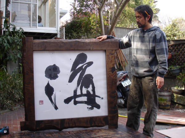 家に戻るとぜひステッカーのぜひを書いてくれた、すいれんさんの作品に兄貴が額を作っていました。コンテストに出す作品らしく、気合いを入れて作っていました。すいれんさんの作品と鎌倉和楽家具の額、とてもマッチしていました。これで優勝間違いなしですね。