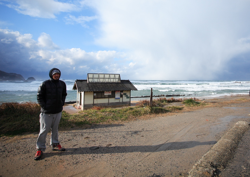 自分と佐藤和也君、そしてフォトグラファーのCharさんと(http://www.charfilm.com/)、西高東低でうねりが上がる日本海へと行ってきました。目差すは京都、網野町八丁浜。鎌倉は、その低気圧から吹き込んだ南風により、気温は20℃近く。12月末には考えられない気温、異常気象。27日、4輪駆動で雪道対策をしつつ、鎌倉を出発。