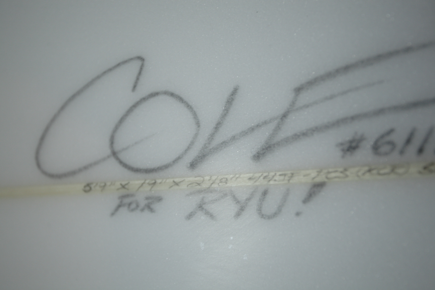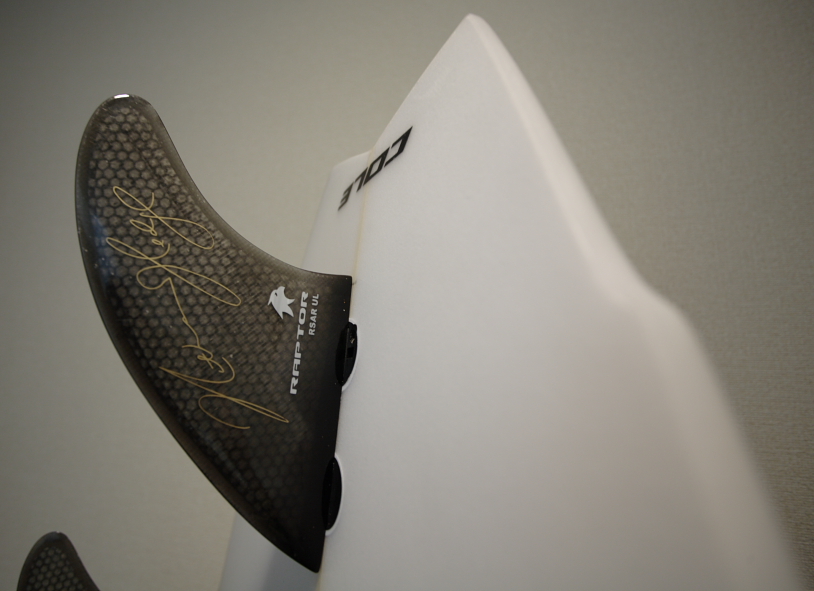今回のSKELTON FISHはこの時点では満点、いや120点。19インチもあるセンターからテールエリアまでダブルウィングにより急激に絞られ、小さい波でもレールを入れられる様に工夫が施されている。Cole独特なものだ。このダブルウィングは見た目も美しくほれぼれした。テールロッカーも絶妙だ。そしてどんな動きをしてくれるのだろうと、想像をかき立てられた。