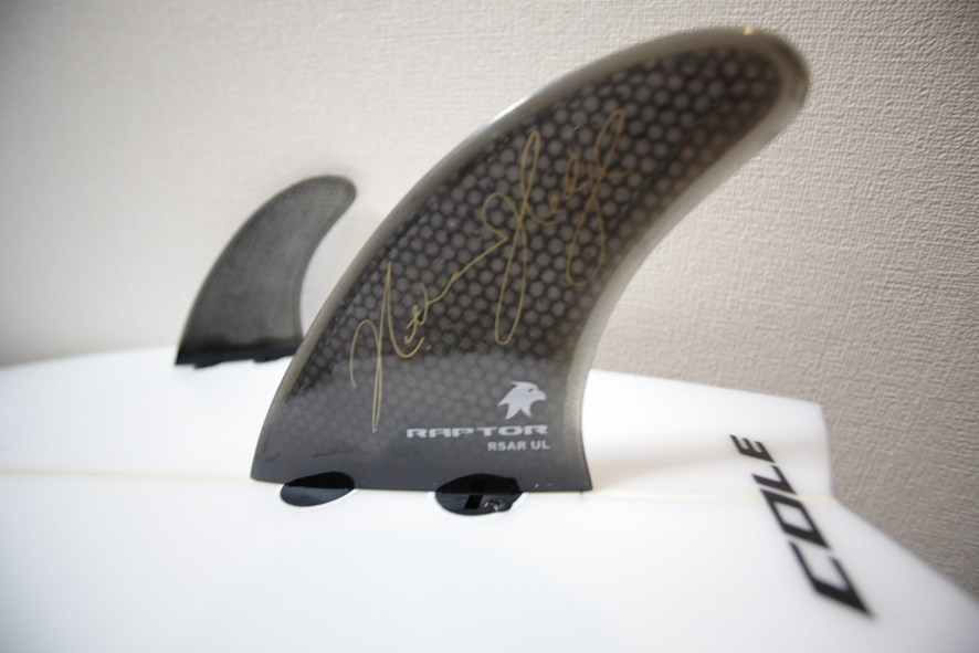 次の日、幸運にも千葉南で波乗りができそうなので、早速SKELTON FISHを持って千葉南へ行ってきた。テスト場所は皆さんもご存知の鴨川。コンディション、サイズは胸〜頭、ビーチブレイク、オフショア。レギュラー、 グーフィー共に形よくグッドコンディション。こんな日にニューボードを試せるのは本当に幸運だ。言い忘れていたが、この板にはRAPTORのプラグが付けてある。フィンはRAPTORのライダー、ネイザンヘッジ(オーストラリア出身のWCTサーファー)のシグネチャーモデル。ハニカムでグラス。とても軽量に作られているフォイルの美しい素晴らしいフィンだ。ブラックにゴールドのサインも高級感があっていい。